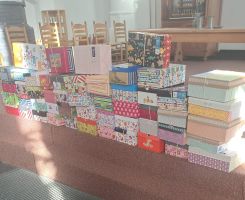 We hebben voldoende financiële bijdragen ontvangen om alle mooie dozen die nu op het podium staan te versturen naar kinderen in Oost-Europa, Afrika of in vluchtelingenkampen in Griekenland. Kinderen die in erbarmelijke omstandigheden moeten opgroeien. Zij ontvangen een prachtig cadeau waarmee ze kunnen leren en spelen. Voor hen een bijzondere ervaring.
