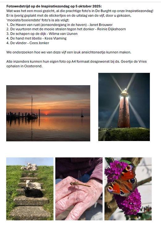 zondag 12 oktober 2025 om 09:30De BurghtVoorganger(s): ds. W. Huizing Organist: Jan Kruithof Via deze link kunt u de dienst online volgen of later terugkijken. Klik hier voor de orde van dienst en hier voor de zondagsbrief. |