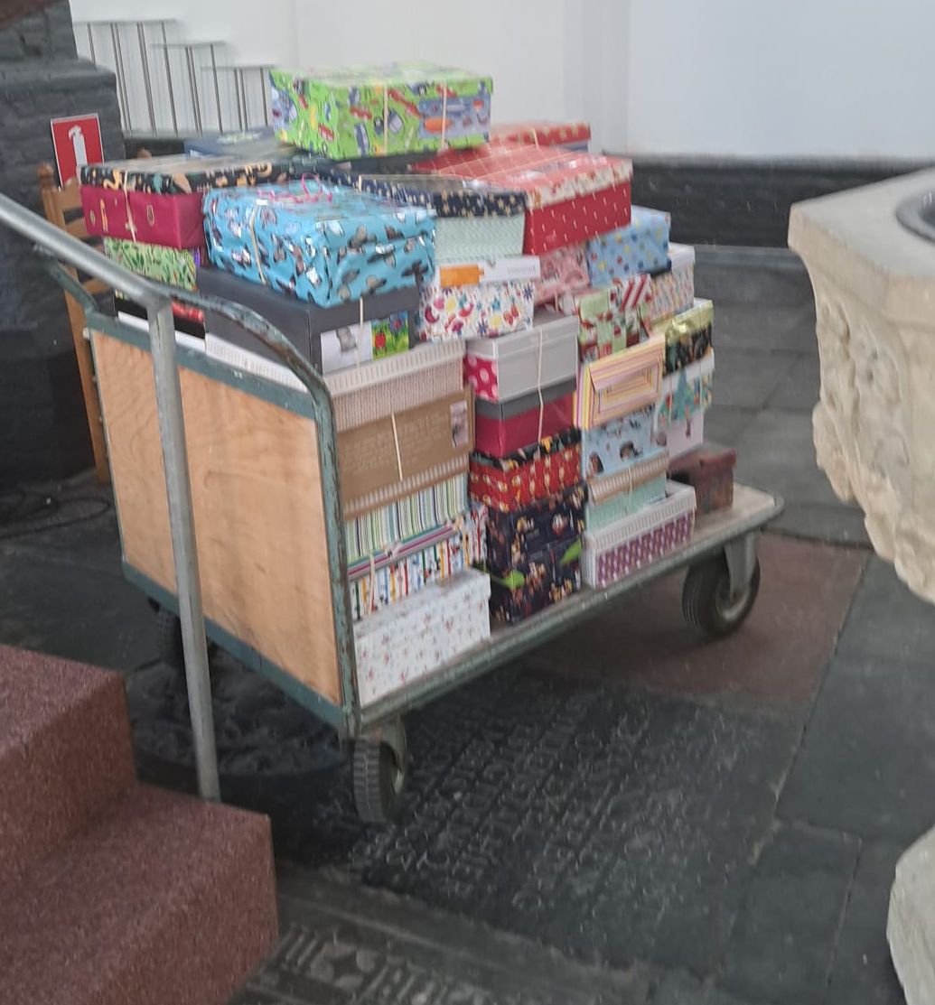 We hebben voldoende financiële bijdragen ontvangen om alle mooie dozen die nu op het podium staan te versturen naar kinderen in Oost-Europa, Afrika of in vluchtelingenkampen in Griekenland. Kinderen die in erbarmelijke omstandigheden moeten opgroeien. Zij ontvangen een prachtig cadeau waarmee ze kunnen leren en spelen. Voor hen een bijzondere ervaring.